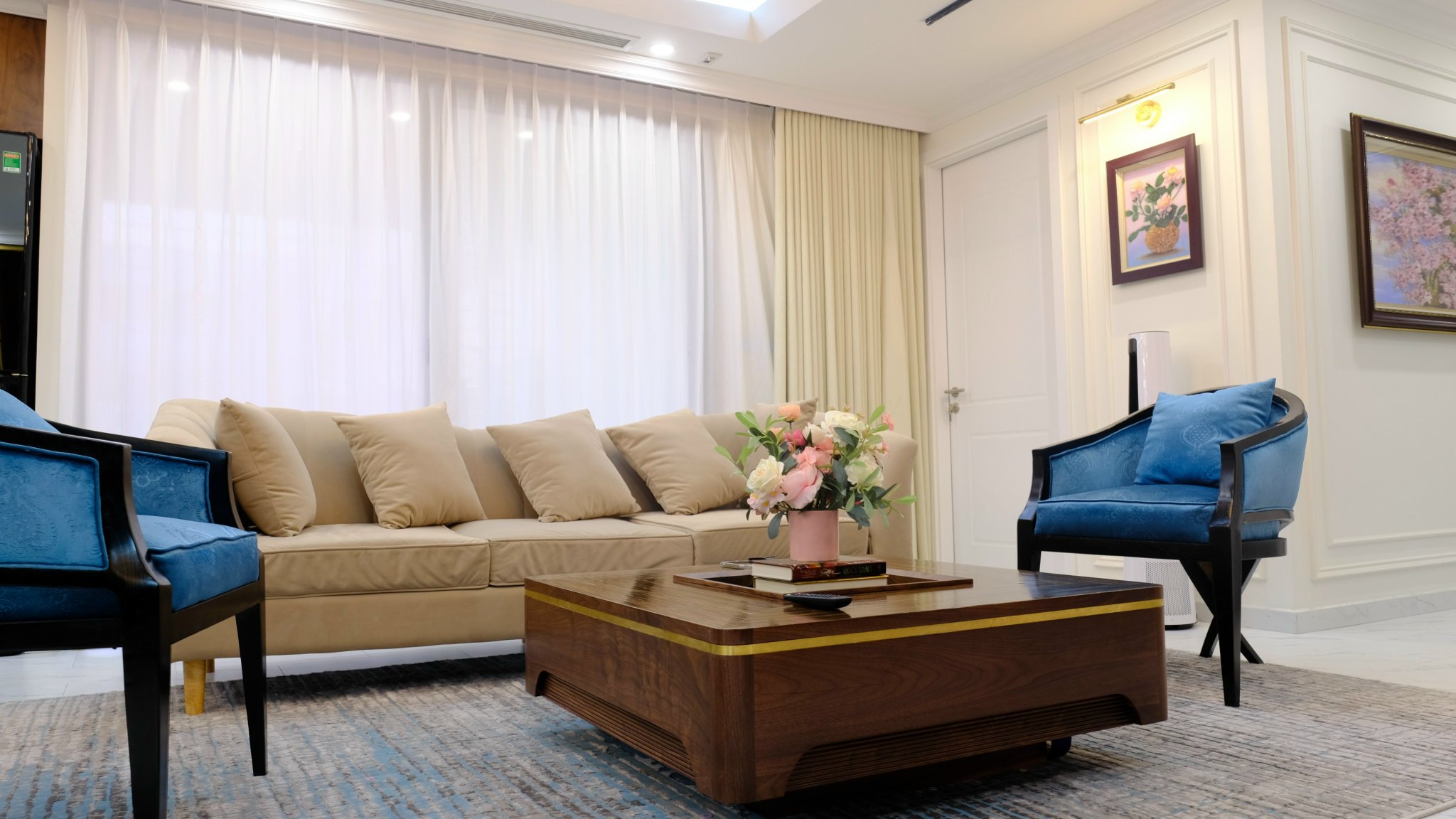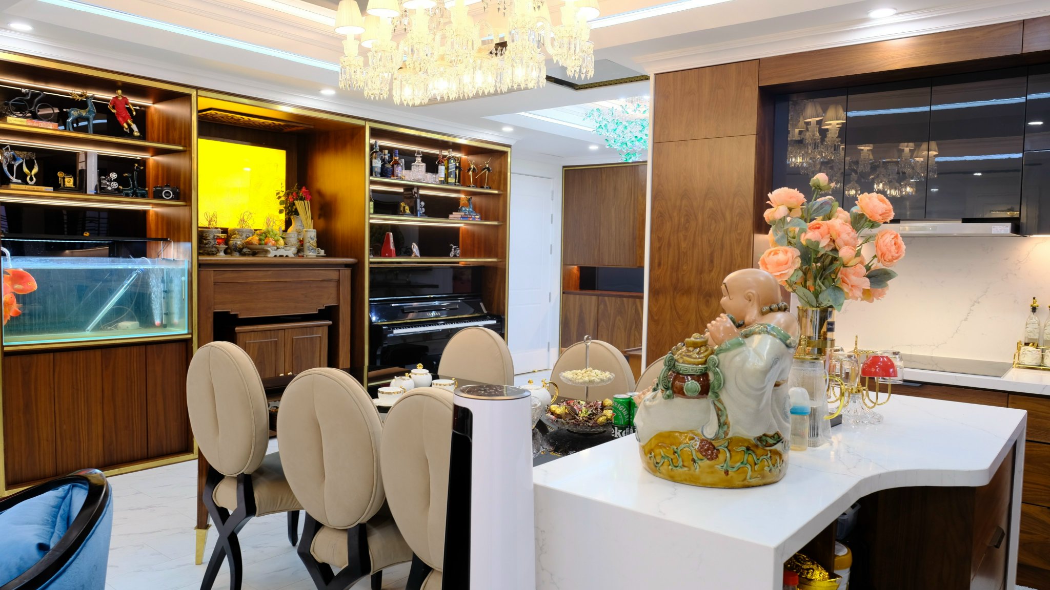 Toàn bộ không giản nội thất phòng khách được sản xuất bằng gỗ tự nhiên kết hợp với veneer gỗ óc chó, mang đến cảm giác ấm cúng và đẳng cấp. Hệ tủ âm tường được thiết kế tinh tế, kết hợp giữa gỗ óc chó tự nhiên và các chi tiết viền kim loại mạ vàng tạo điểm nhấn hiện đại.