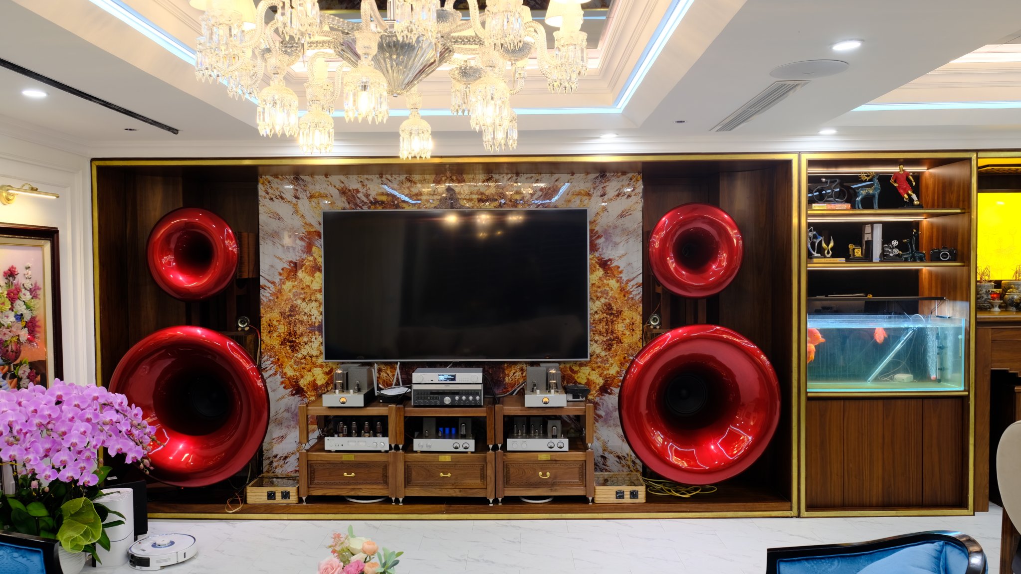 Điểm nhấn của mảng vách tường là vị trí đặt tivi, nơi thể hiện rõ sở thích đặc biệt của gia chủ với hệ thống âm thanh cao cấp. Trung tâm bức tường là một chiếc TV màn hình lớn, được bao quanh bởi hệ thống loa kèn kích thước “khủng” với sắc đỏ nổi bật, đầy ấn tượng và đậm chất chơi audio chuyên nghiệp