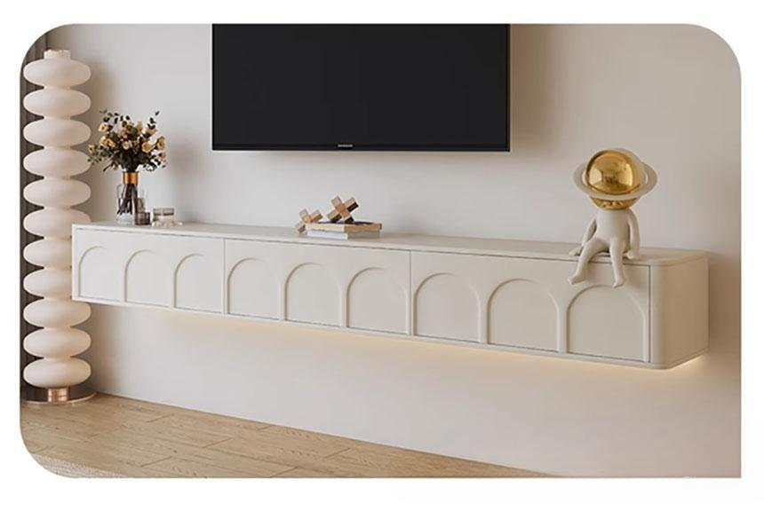 Kệ tivi nổi bật với thiết kế treo tường tối giản, giúp tiết kiệm không gian nhưng vẫn mang đến sự sang trọng và tiện nghi. Bề mặt kệ được thiết kế với họa tiết vòm mềm mại, tạo điểm nhấn độc đáo cho không gian phòng khách. Gam màu trắng trang nhã dễ dàng kết hợp với nhiều phong cách nội thất khác nhau, từ hiện đại, tối giản đến Scandinavian.