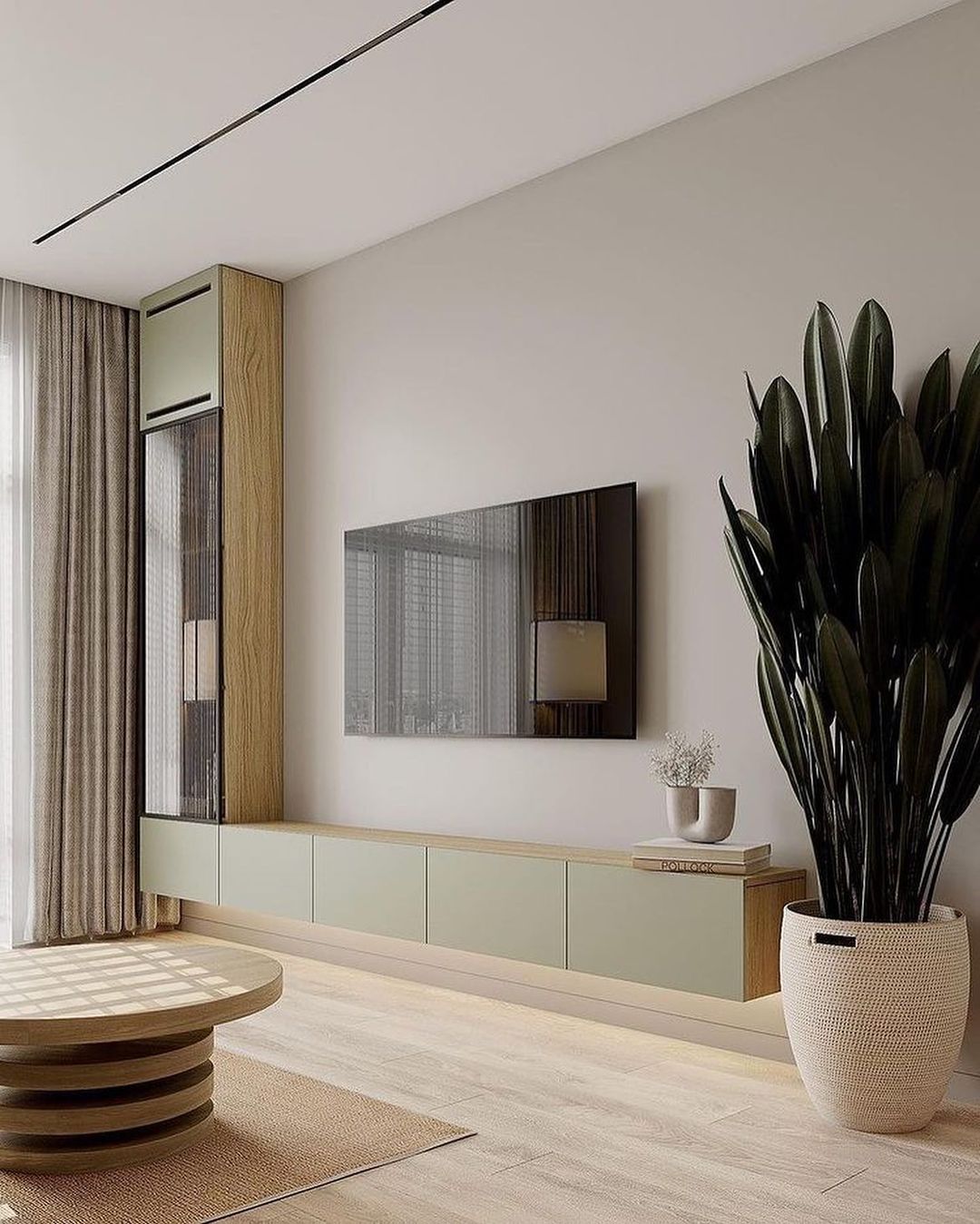 Kệ TV được thiết kế thấp, ngang tầm mắt, đồng thời kết hợp với tủ treo tường tạo cảm giác nhẹ nhàng, không chiếm diện tích sàn – đúng chuẩn Bắc Âu. Màu vân gỗ sáng kết hợp cùng cánh tủ trắng giúp tổng thể phòng khách trở nên sáng sủa, hiện đại hơn. Đây là ví dụ tiêu biểu cho sự tối giản nhưng vẫn tiện nghi trong thiết kế của XLINE.