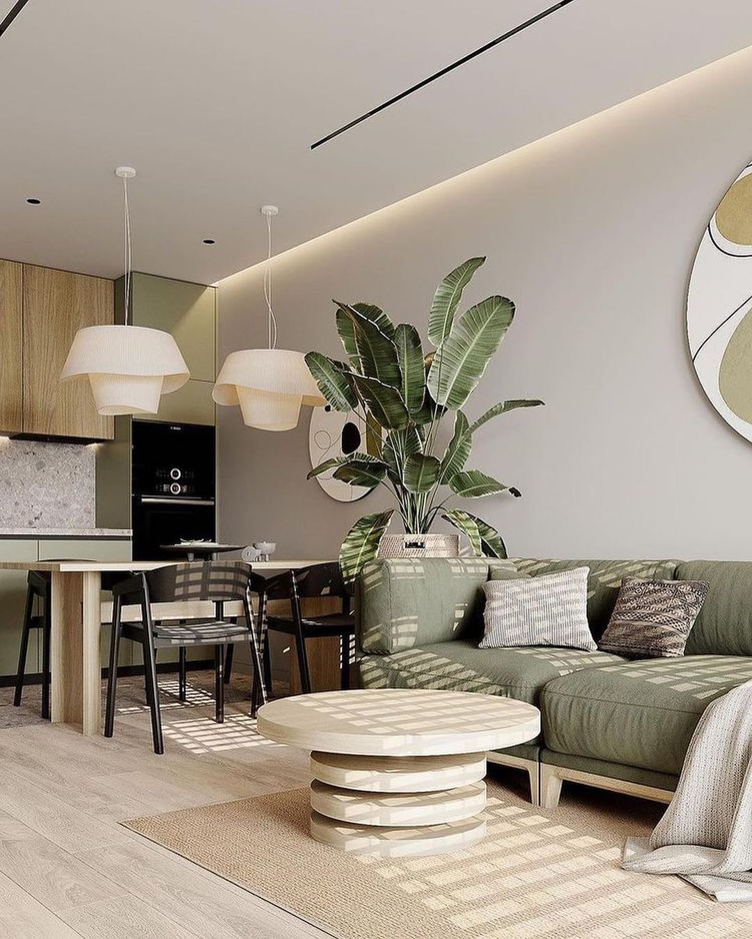 Thiết kế liên thông giữa phòng khách và bếp là giải pháp hoàn hảo cho nhà có diện tích hạn chế. Sự chuyển tiếp mượt mà giữa hai khu vực nhờ màu sắc đồng bộ và vật liệu gỗ nhẹ tạo nên tổng thể hài hòa, ấm cúng. Kệ trang trí nhỏ phía sau ghế sofa vừa làm vách ngăn nhẹ, vừa tạo điểm nhấn cho không gian mà không hề gây rối mắt.
