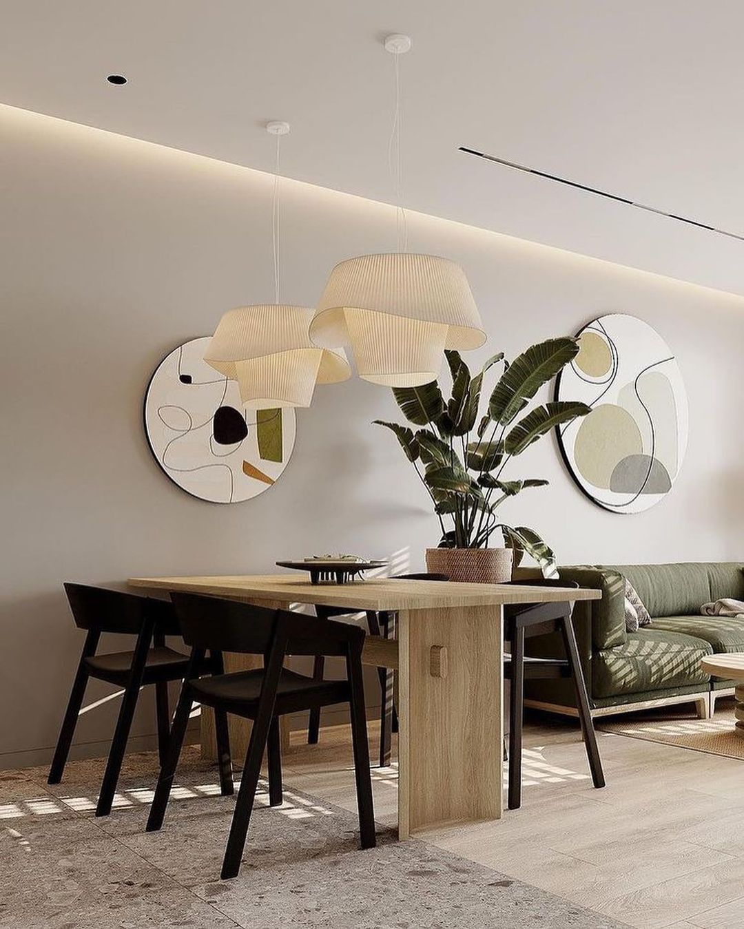 Tranh canvas đen trắng với đường nét nghệ thuật đơn giản là lựa chọn không thể thiếu trong phong cách Bắc Âu – vừa tăng tính thẩm mỹ, vừa thể hiện gu thẩm mỹ tinh tế của gia chủ. Kết hợp cùng đèn thả kiểu dáng tối giản nhưng độc đáo, không gian phòng khách trở nên sinh động và có điểm nhấn rõ ràng mà vẫn giữ được sự tinh khiết, nhẹ nhàng.