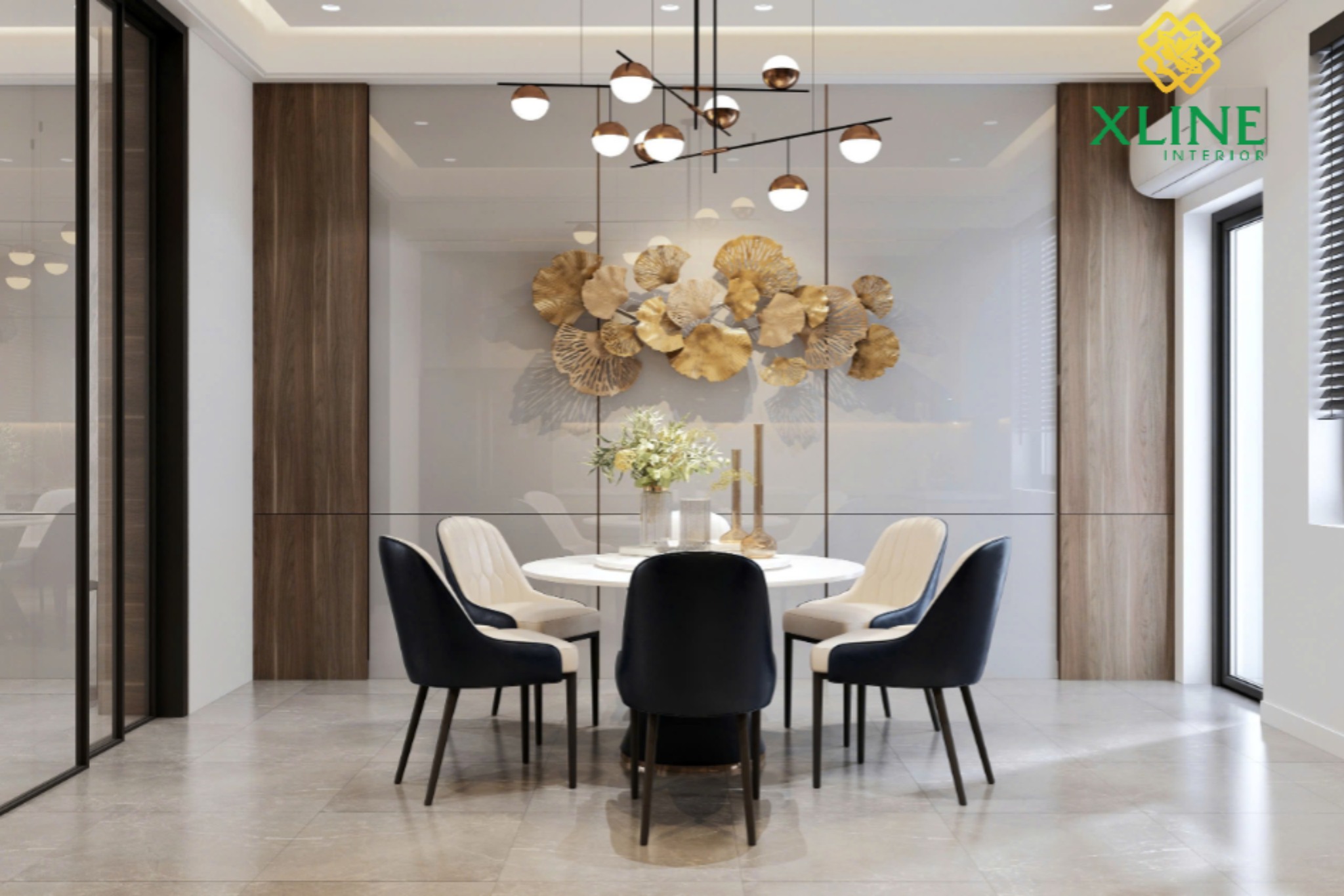 Bộ bàn ăn tròn với mặt đá trắng kết hợp cùng những chiếc ghế bọc da màu xanh đậm và trắng tạo nên điểm nhấn thanh lịch. Bức tường kính ngăn cách với phòng khách giúp không gian vừa có sự riêng tư vừa giữ được sự kết nối, tạo nên một tổng thể hài hòa, hiện đại và tiện nghi.