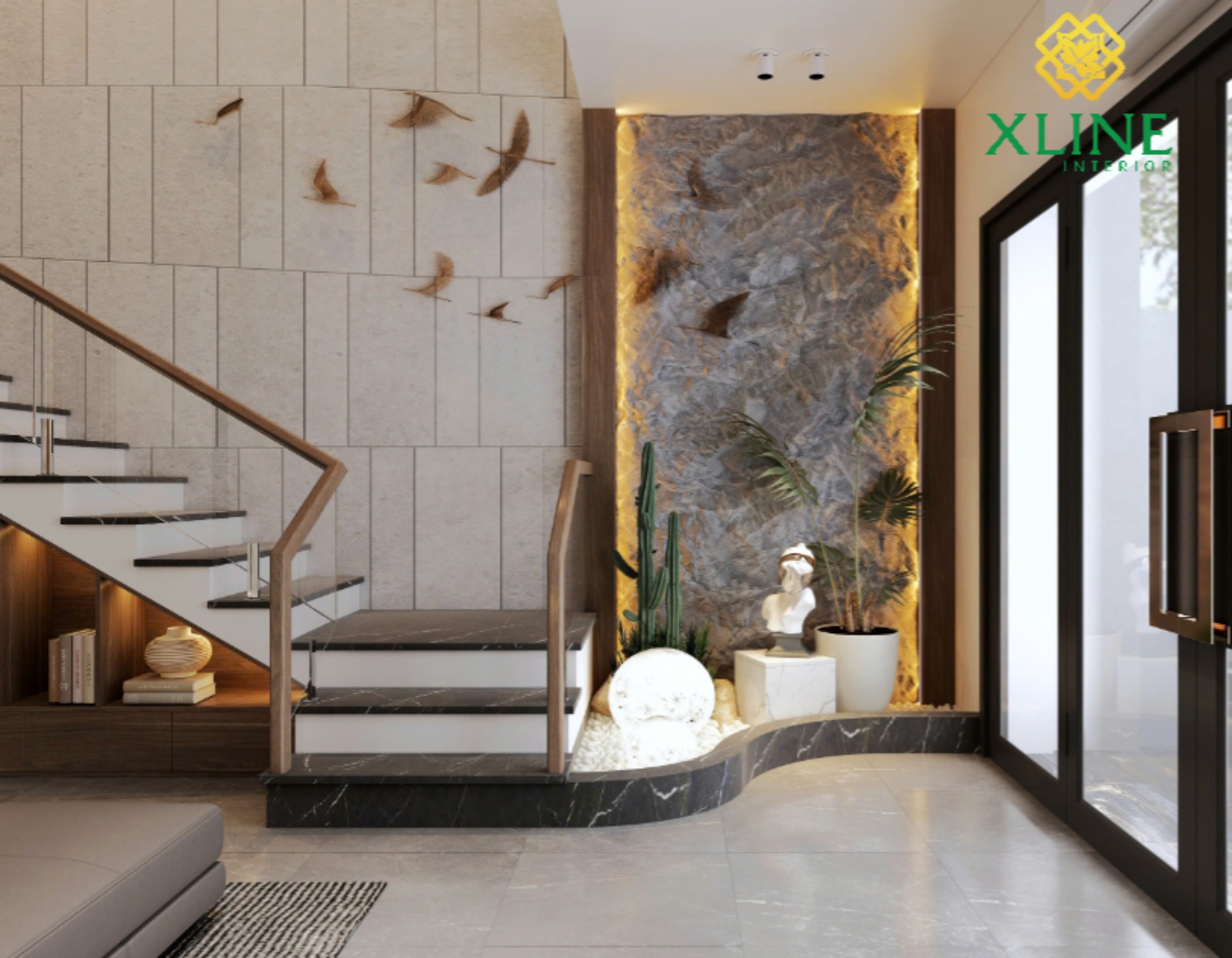Bức tường bên cạnh được trang trí bằng các chi tiết nghệ thuật hình cánh chim bay, mang đến cảm giác nhẹ nhàng, thanh thoát. Đây là một mẫu thiết kế lý tưởng cho những ai yêu thích sự tối giản nhưng vẫn đầy tinh tế và hiện đại.