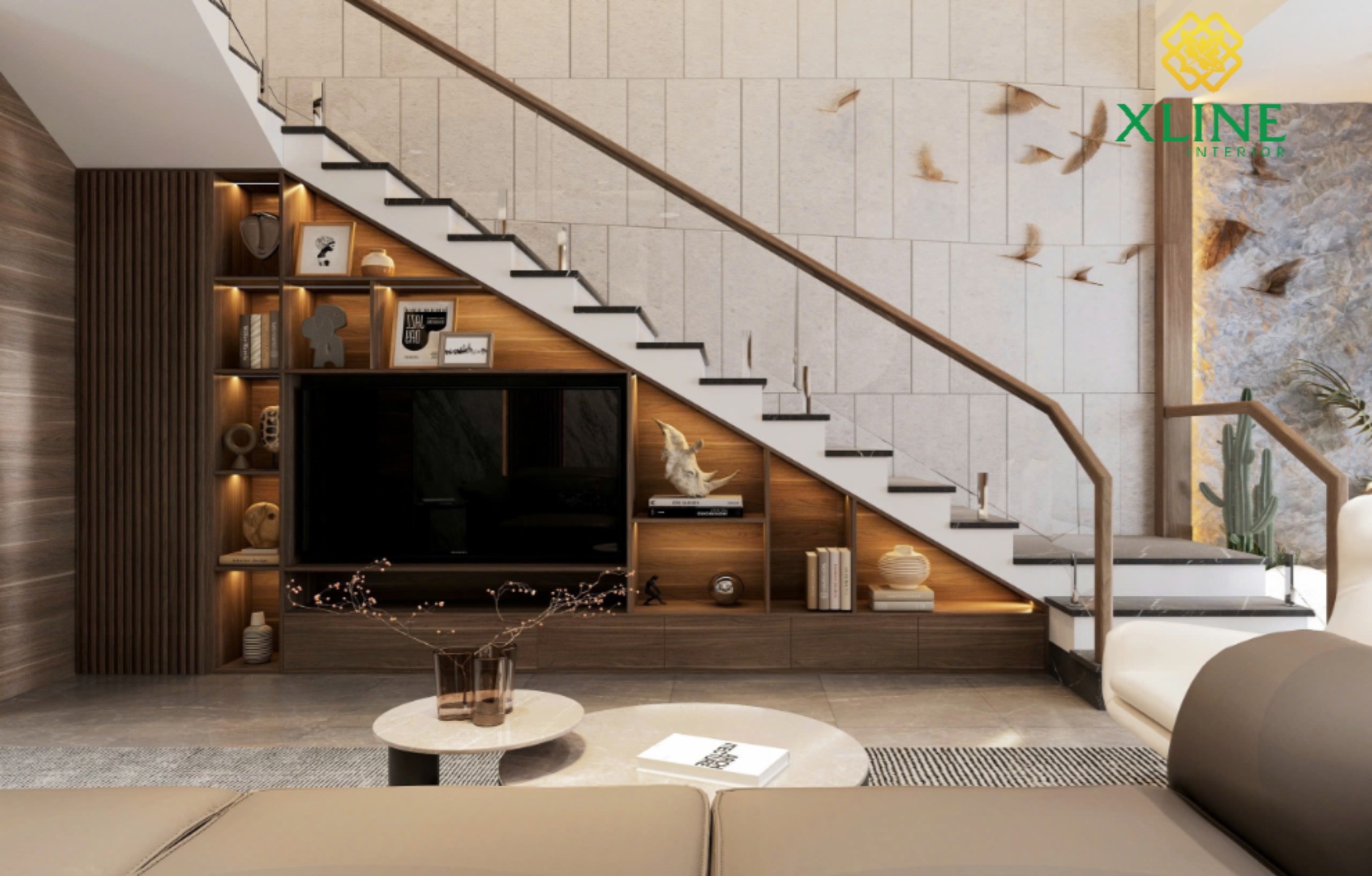 Không gian phía trước tầng 1 được sử dụng làm phòng khách với thiết kế hiện đại và sang trọng, tận dụng không gian dưới cầu thang để tạo nên một khu vực giải trí tinh tế.