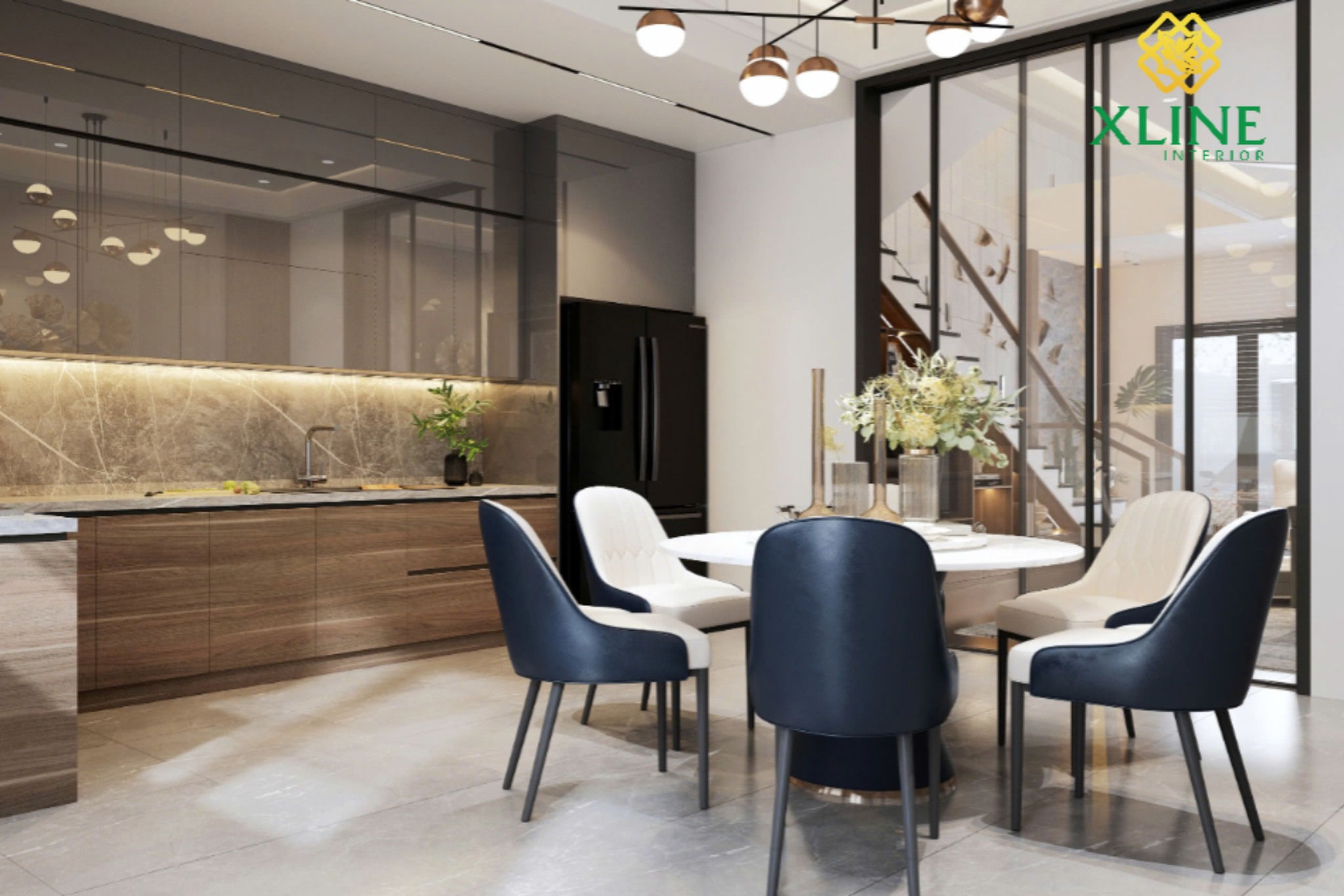không gian bếp và phòng ăn phía sau hiện đại, tinh tế với thiết kế mở, tạo cảm giác rộng rãi và thoáng đãng. Khu vực bếp sử dụng chất liệu gỗ kết hợp với mặt đá tự nhiên và hệ tủ bóng kính, mang đến vẻ đẹp sang trọng và đẳng cấp. Hệ thống đèn LED âm tường giúp tôn lên sự ấm cúng cho không gian.