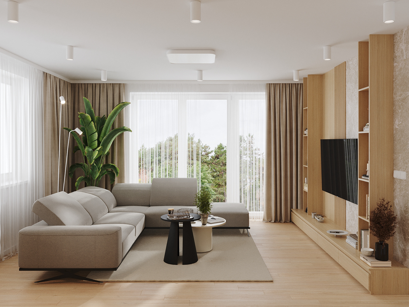 Phòng khách sử dụng bộ sofa chữ L vải nỉ nhã nhặn, hướng về mảng tường TV ốp đá vân mây kết hợp lam gỗ dọc – điểm nhấn đầy tinh tế và sang trọng. Kệ TV thiết kế treo, vừa hiện đại vừa giúp dễ vệ sinh sàn nhà.