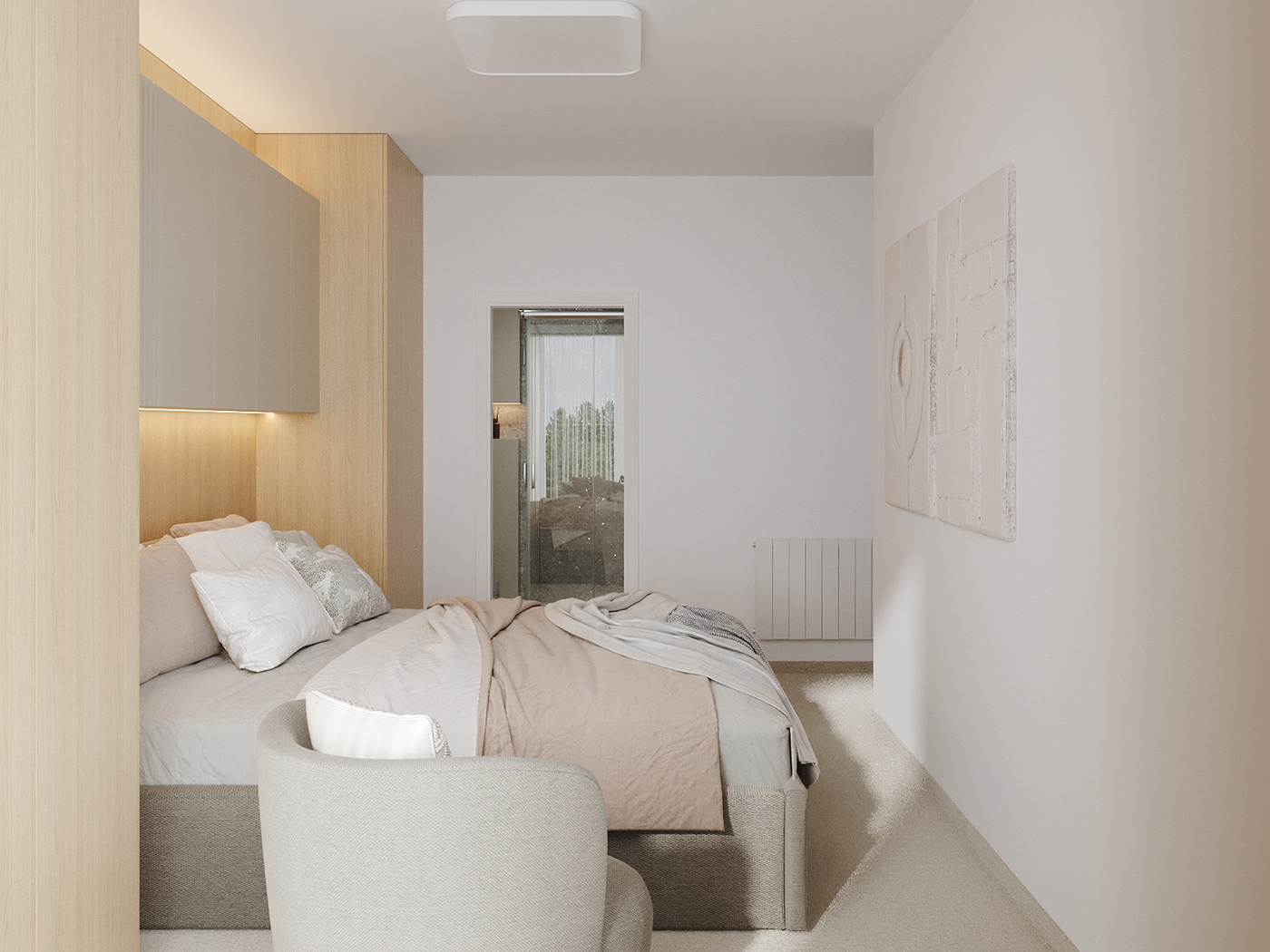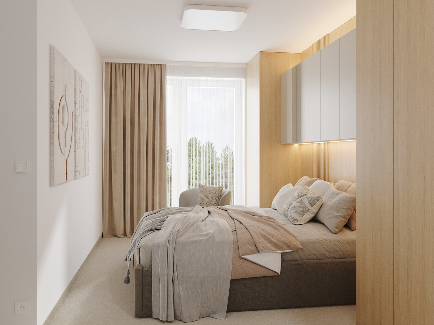 Giường ngủ thấp với bộ chăn ga trung tính, tạo cảm giác gần gũi và dễ chịu. Một chiếc ghế đọc sách đặt cạnh cửa sổ lớn, nơi ánh sáng tràn vào mỗi buổi sáng – hoàn hảo cho những phút giây thư giãn.