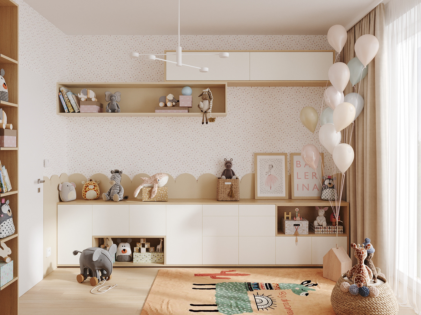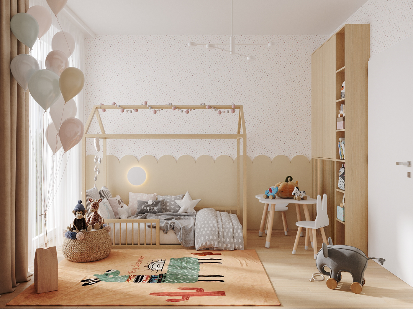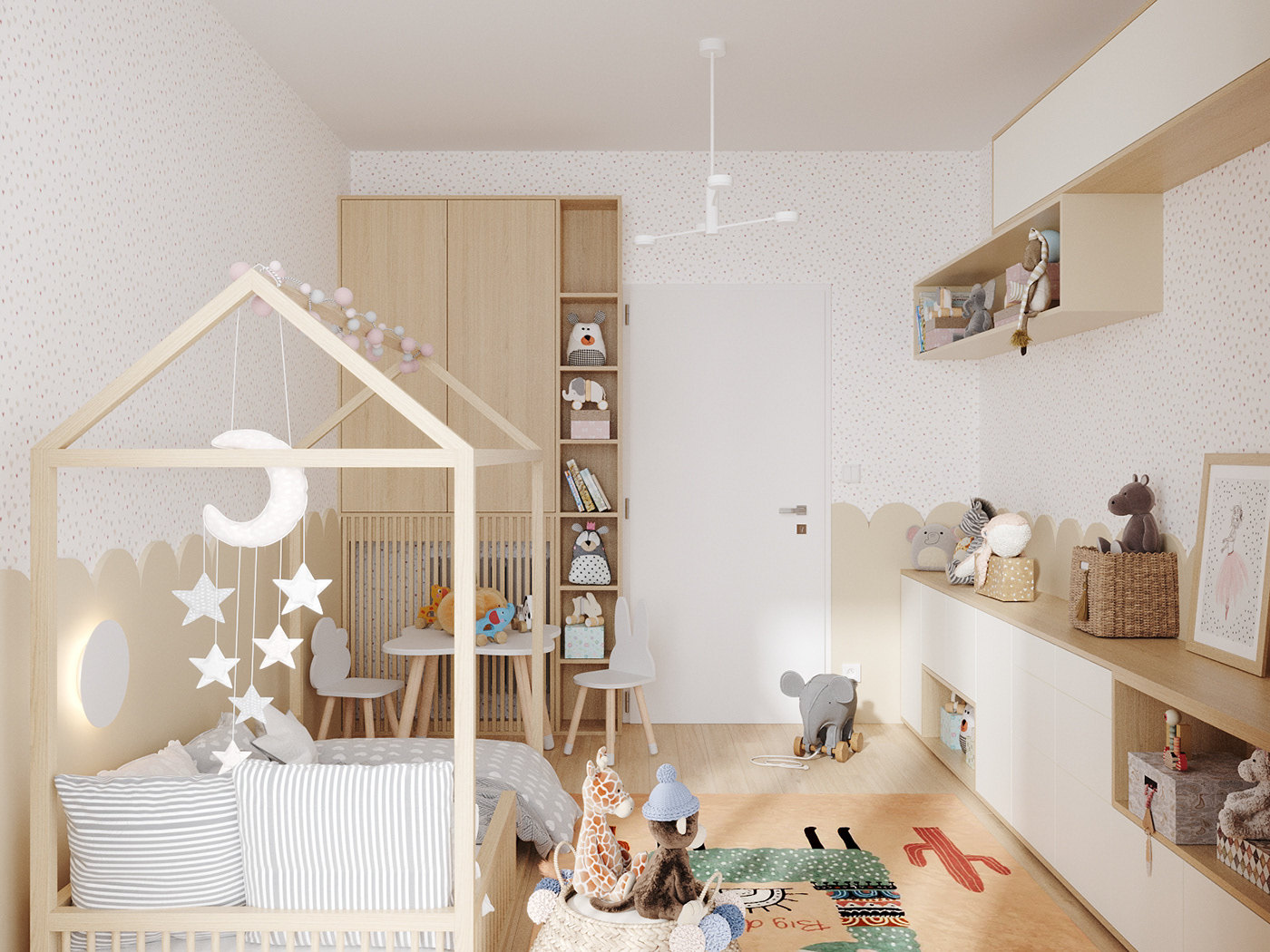 Tường phòng được dán giấy họa tiết nhỏ, kết hợp viền bo hình răng cưa như hàng rào – chi tiết tinh tế tăng tính trẻ thơ. Toàn bộ nội thất đều được bo tròn cạnh, chất liệu gỗ tự nhiên kết hợp MDF chống trầy, thân thiện và dễ vệ sinh.