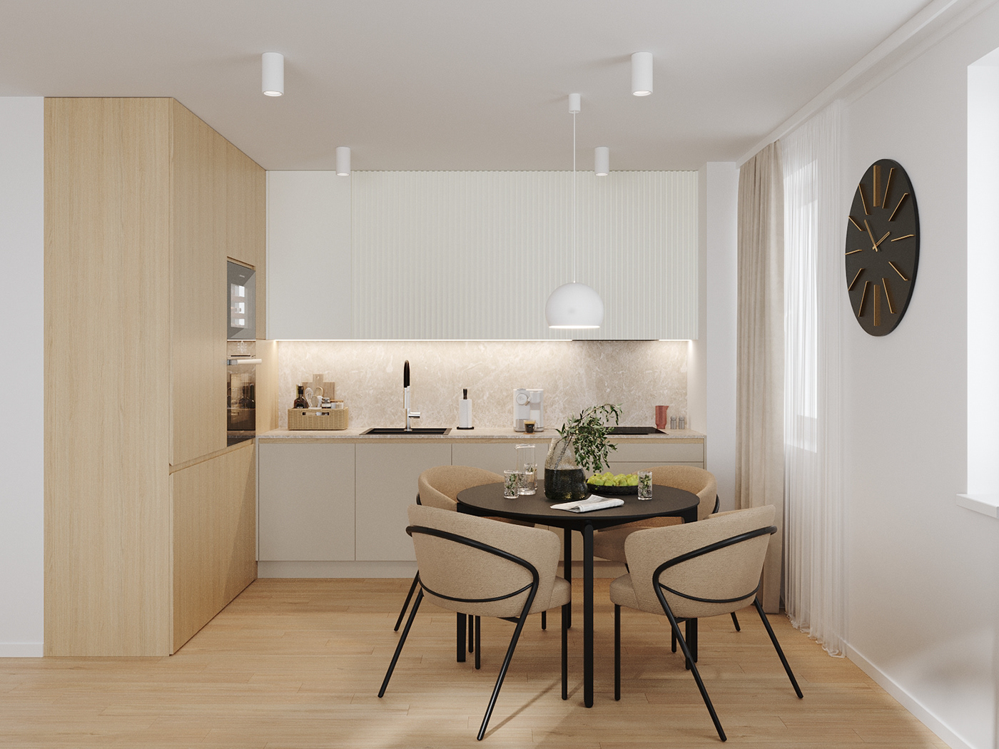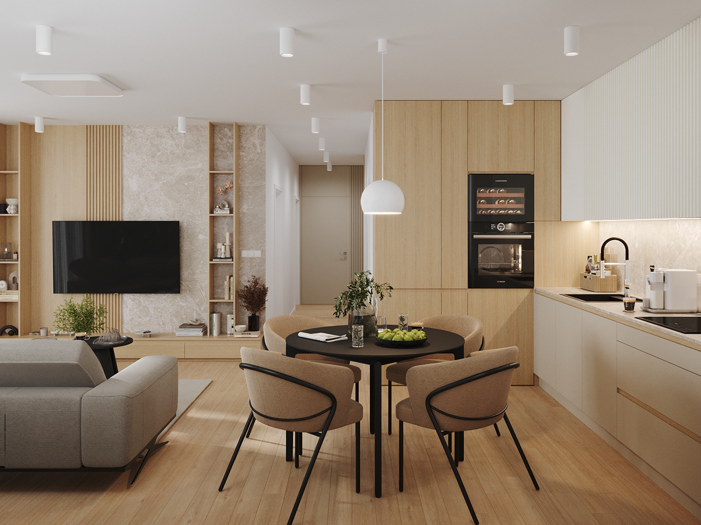 Ngay khi bước vào căn hộ, không gian mở giữa phòng khách – bếp – bàn ăn tạo cảm giác liền mạch và rộng rãi. Gam màu trung tính chủ đạo gồm trắng kem, be và gỗ sồi sáng mang đến sự thư giãn, đồng thời giúp không gian “ăn gian” diện tích một cách tinh tế.