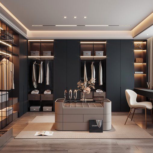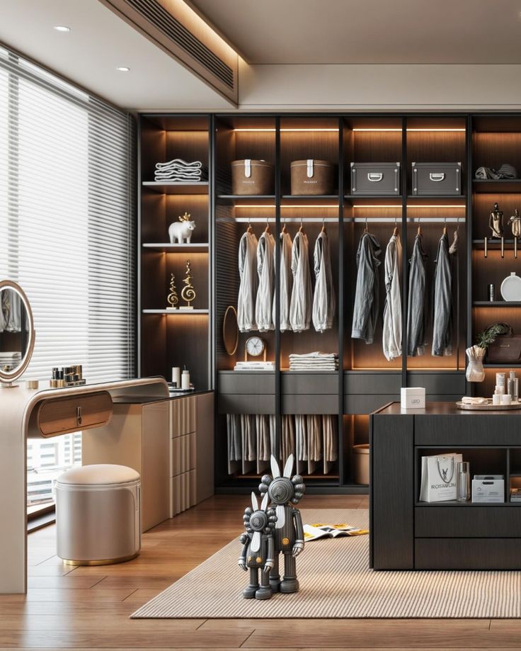 Mẫu tủ quần áo cánh kính của Xline gây ấn tượng mạnh với thiết kế mở, kết hợp chất liệu kính cường lực trong suốt và khung kim loại cao cấp. Sự phối hợp giữa gam màu tối sang trọng và hệ thống đèn LED âm tạo hiệu ứng ánh sáng ấm áp, giúp không gian trở nên đẳng cấp hơn.