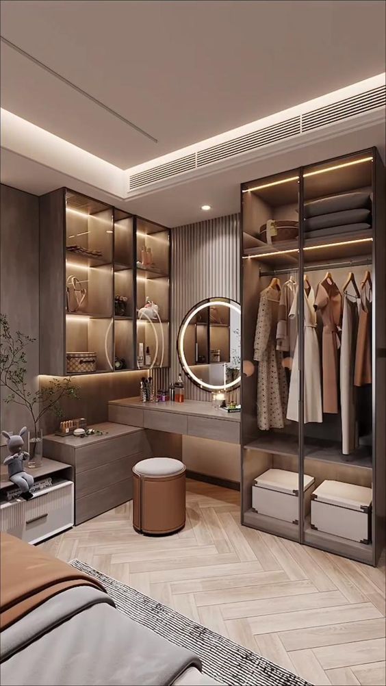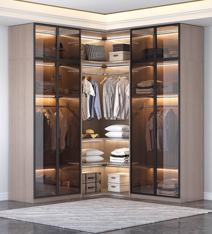 Điểm đặc biệt của mẫu tủ này là hệ thống đèn LED cảm ứng thông minh, giúp chiếu sáng và tôn lên vẻ đẹp của từng món đồ bên trong. Không chỉ giúp dễ dàng tìm kiếm đồ dùng, ánh sáng vàng dịu còn tạo nên không gian ấm cúng, sang trọng.